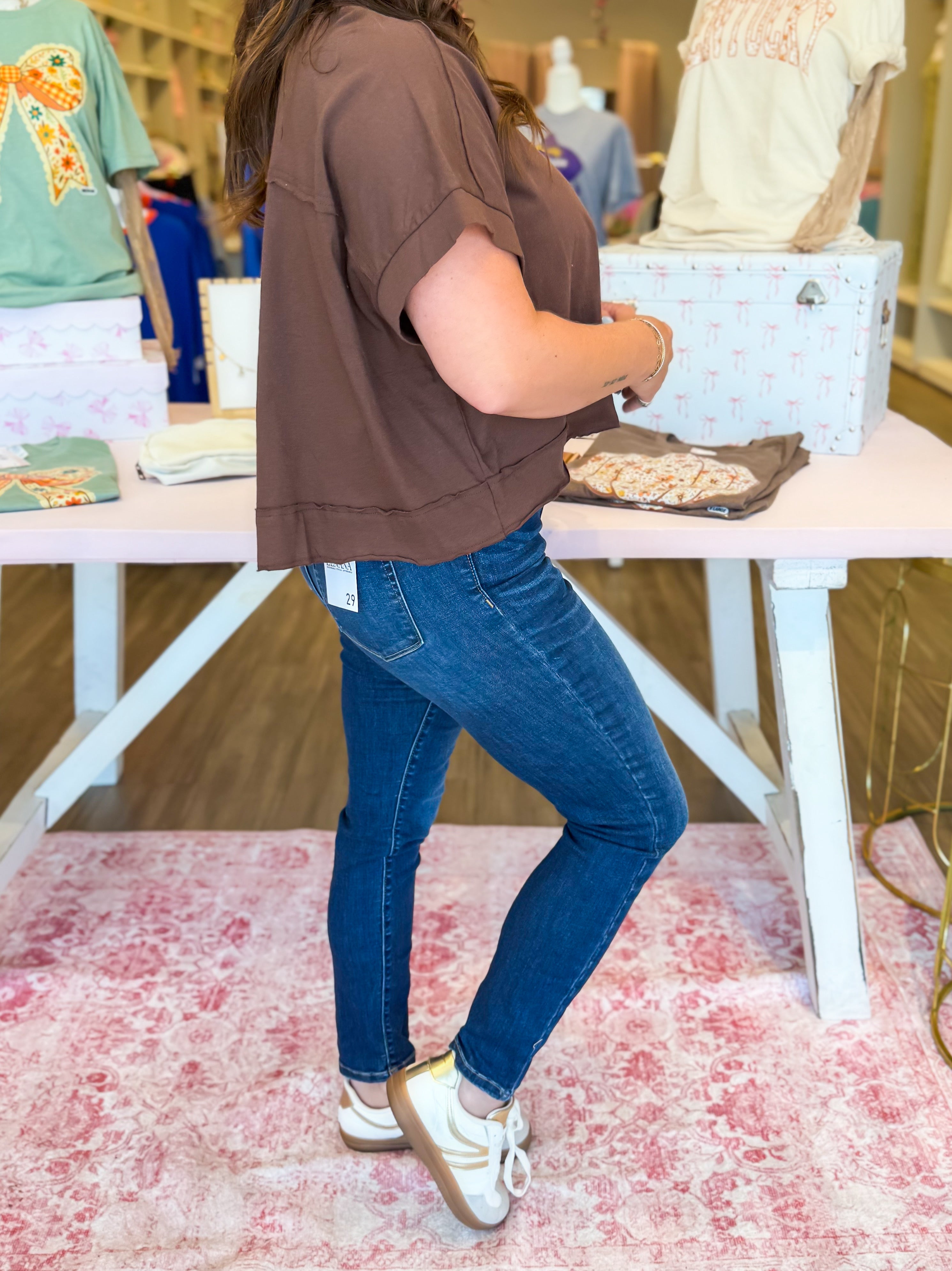Meet your new everyday essential—the Cocoa Crush Crop Tee. This relaxed-fit top features a rich mocha brown color, a trendy cropped hemline, and a front pocket detail that adds the perfect touch of casual-cool. With its soft cotton feel and boxy silhouette, it’s easy to style with high-rise denim, skirts, or layered under your favorite jacket. A must-have for effortless boutique style that works year round.