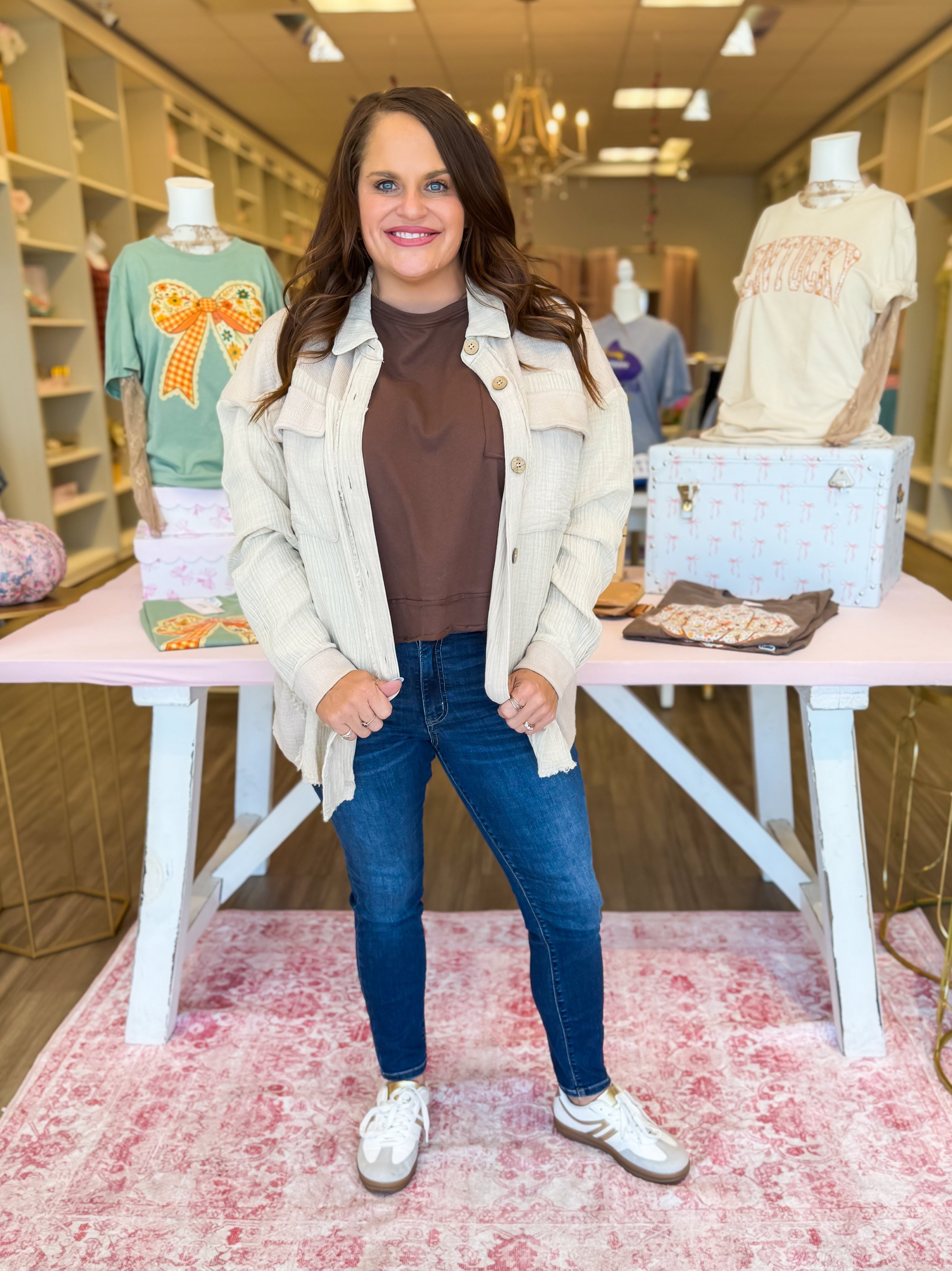 Add a pop of soft, feminine color to your layering game with our cozy Dreams Shacket. This lightweight yet cozy piece combines the ease of a shirt with the warmth of a jacket, making it the perfect transition layer for any season. The muted blush tone keeps it girly yet versatile, while the button-front detail, chest pockets, and relaxed fit make styling effortless. Throw it over a basic tee, crop top, or dress for an instantly polished boutique look.