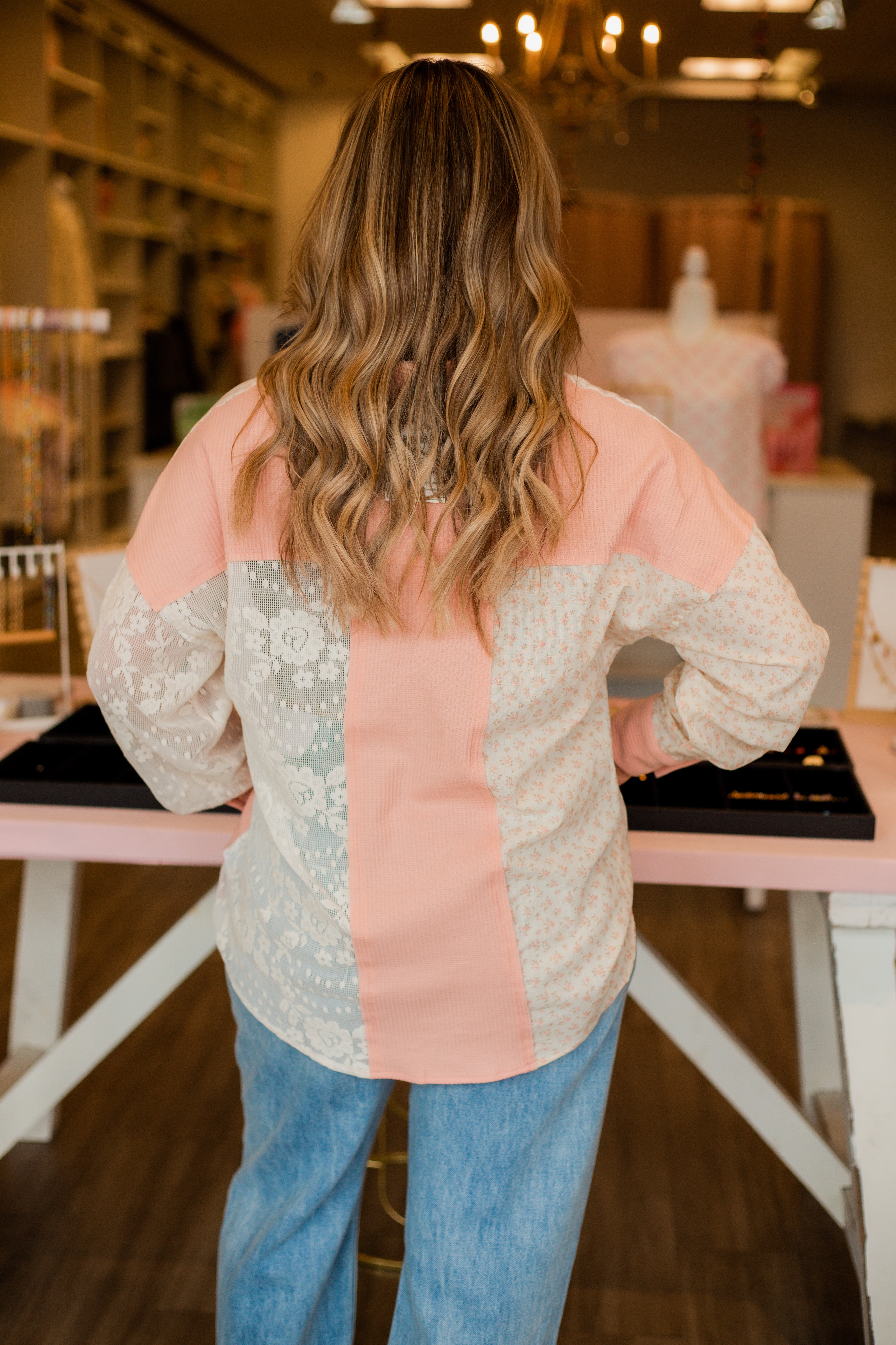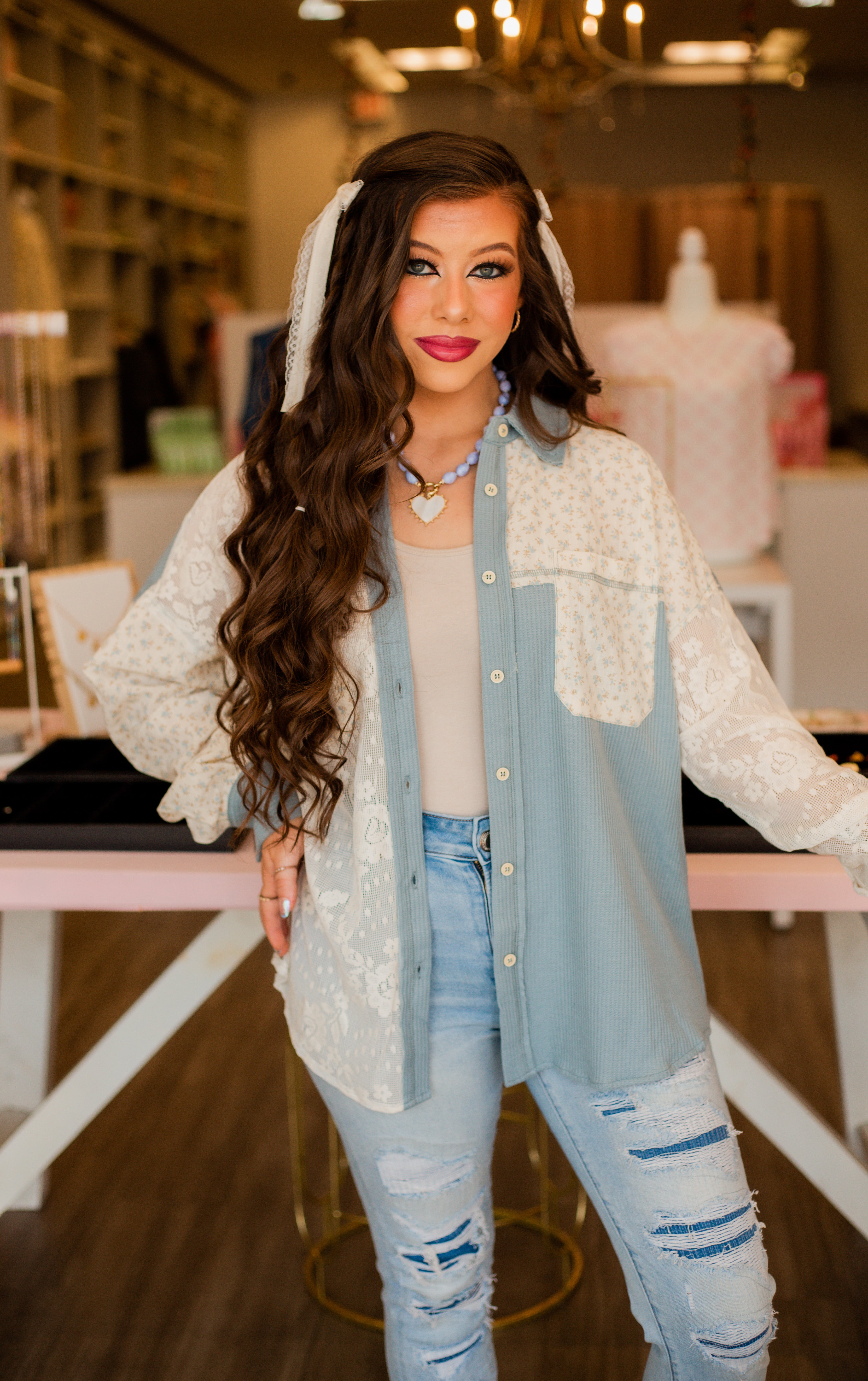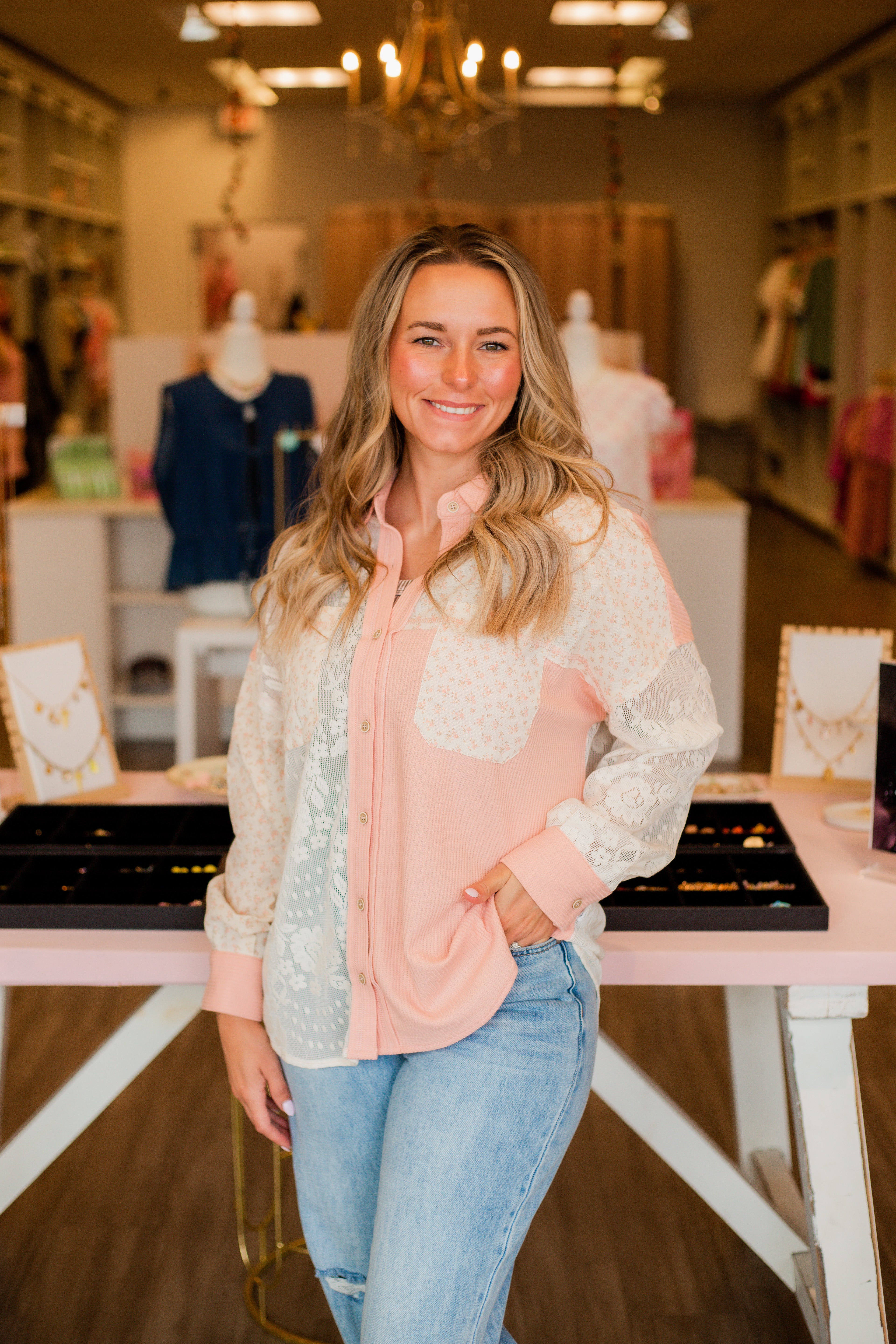 Elevate your everyday style with our Sweet Lace Patchwork Button-Up Top—a boutique favorite! This long sleeve top features a mix of soft waffle knit fabric and vintage-inspired floral lace sleeves, creating a feminine yet casual look. The pastel pink and blue hues, raw-edge hem, and relaxed fit make it the perfect layering piece for fall or spring. Pair it with your favorite denim for a cozy, stylish outfit. A must-have for women who love boutique fashion with a vintage twist.