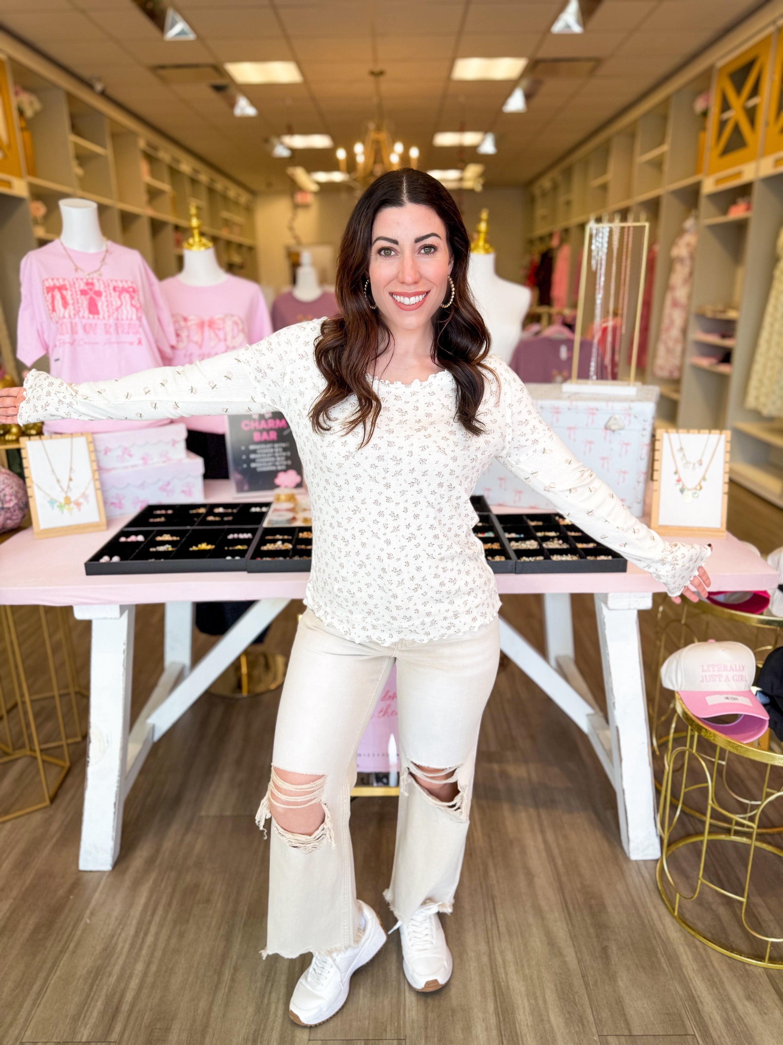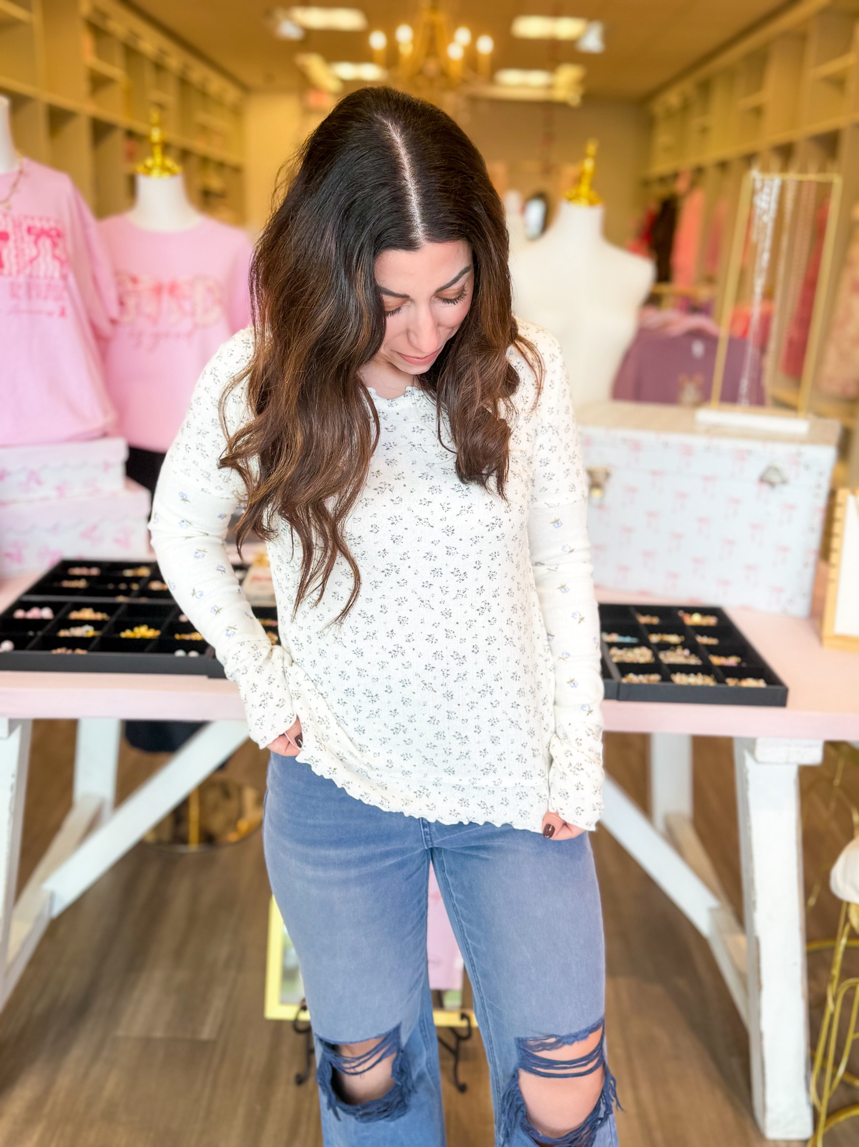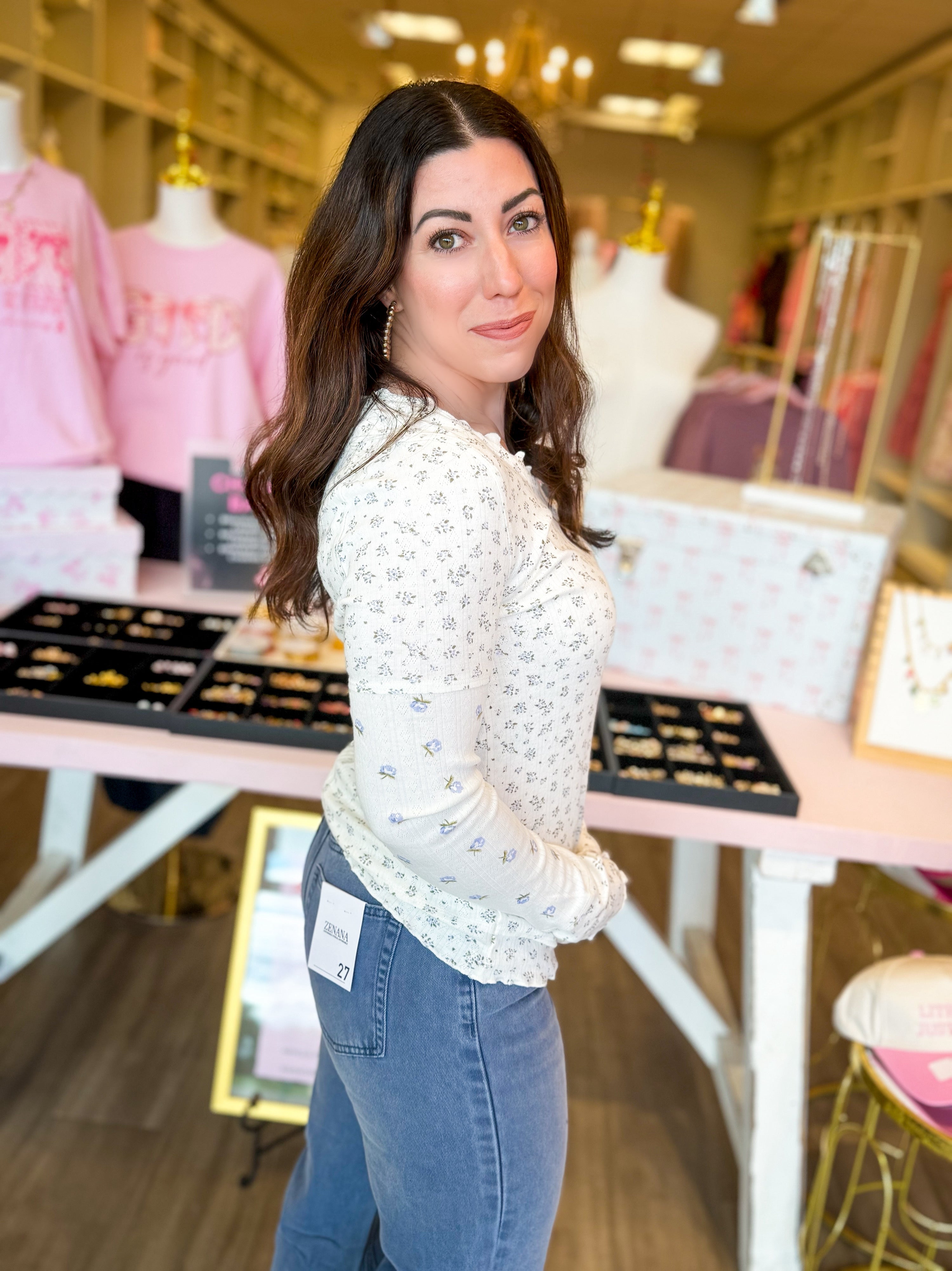 A touch of romance for your everyday wardrobe 💕. The Sweet Meadow Long Sleeve Top features a soft ribbed knit with dainty allover florals, a feminine lettuce-edge neckline, and delicate sleeve detail. Available in pink floral and blue floral, this versatile piece pairs perfectly with jeans for a casual day look or can be dressed up with a skirt for a sweet evening vibe.