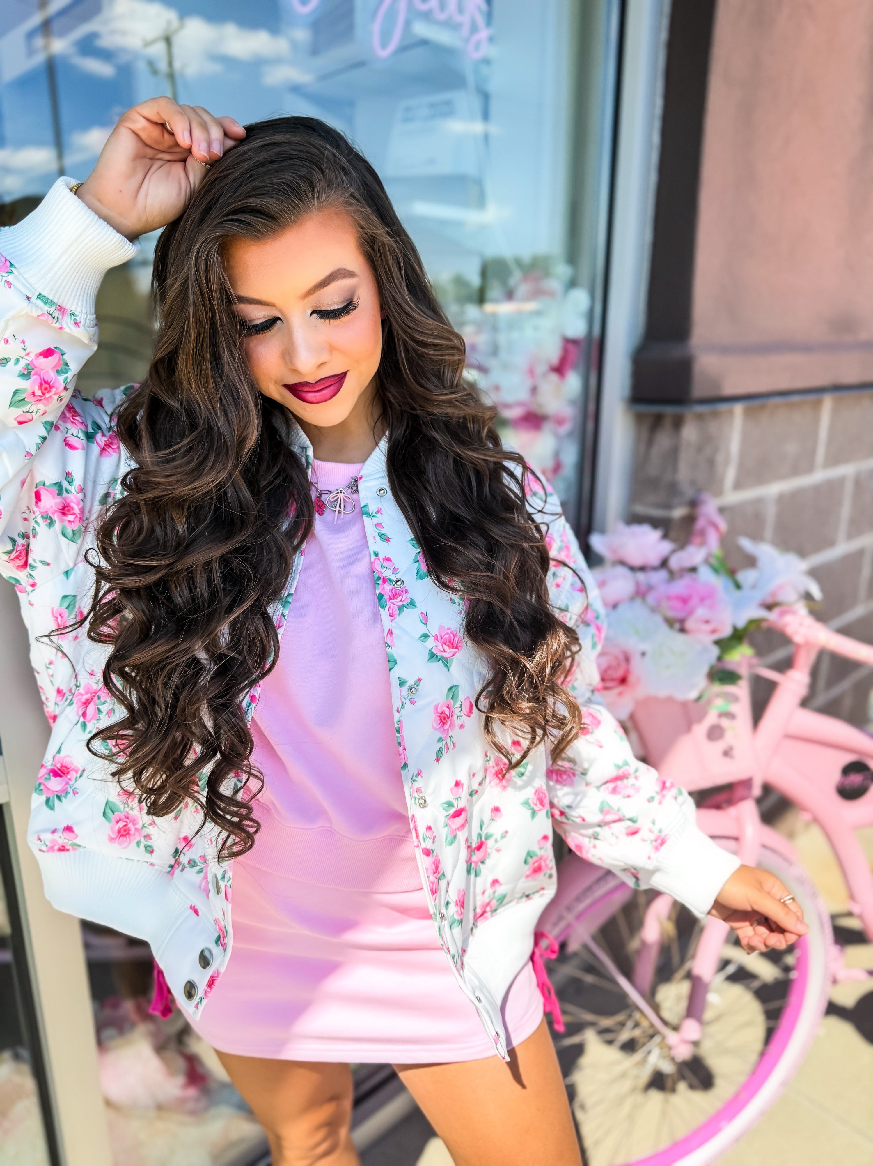 Stay effortlessly stylish in our Garden Glow Quilted Bomber. This oversized jacket is covered in the sweetest floral print on a crisp white background, giving you that girly-chic vibe we all love. The quilted texture adds a cozy touch while the relaxed bomber fit keeps it casual and easy to layer. Perfect for throwing over a basic tee, pairing with jeans, or dressing up your activewear for an elevated look. A must-have statement piece for your fall wardrobe!