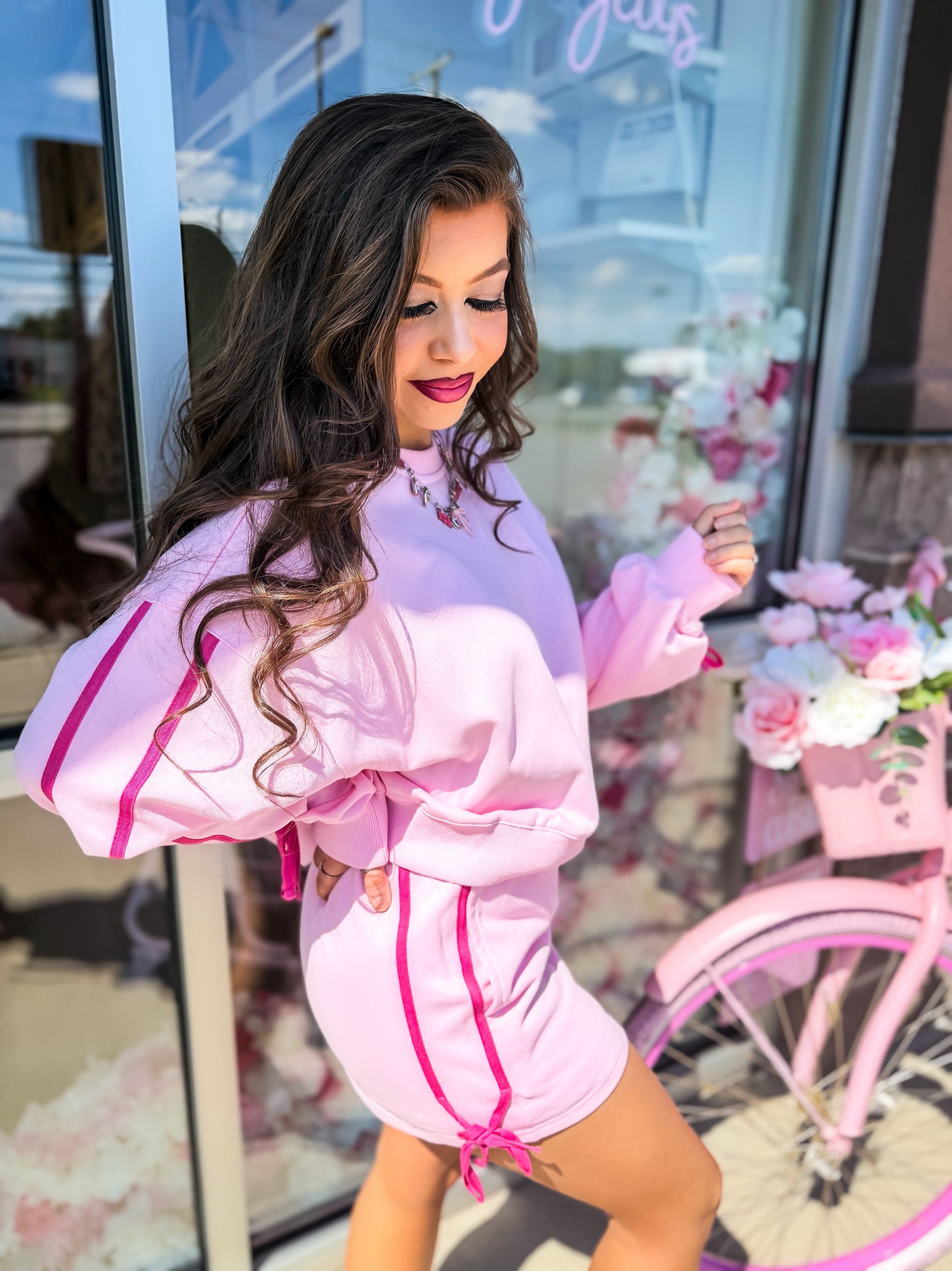 Stay cute and comfy in our Sweet Streak Lounge Set – the perfect blend of sporty chic and feminine flair. This cream-pink two-piece features an oversized sweatshirt with hot pink side stripes and the matching mini skort with bow-tie accents. Effortless to throw on, yet stylish enough to turn heads, it’s your go-to for coffee runs, game days, or just lounging in style.