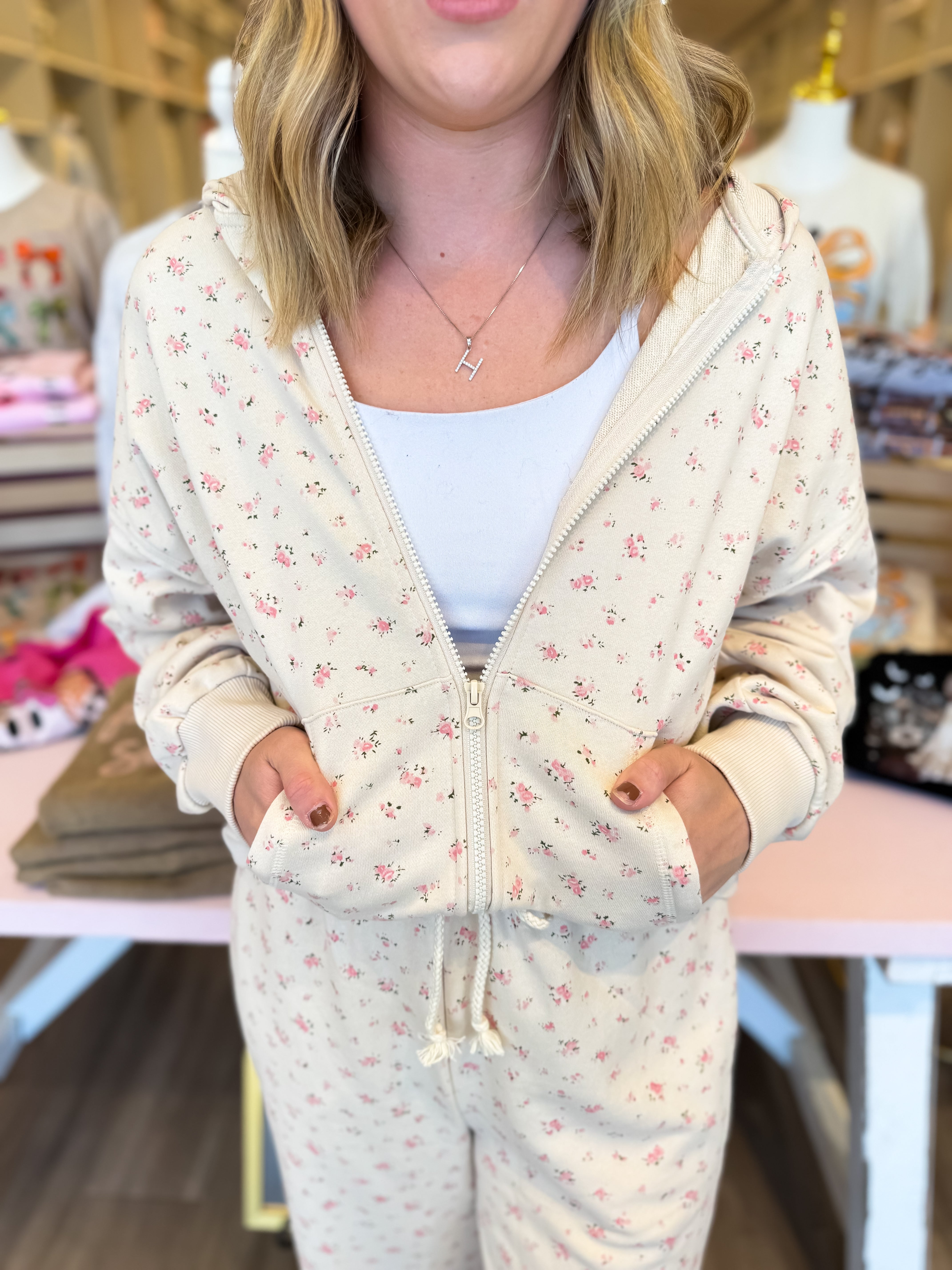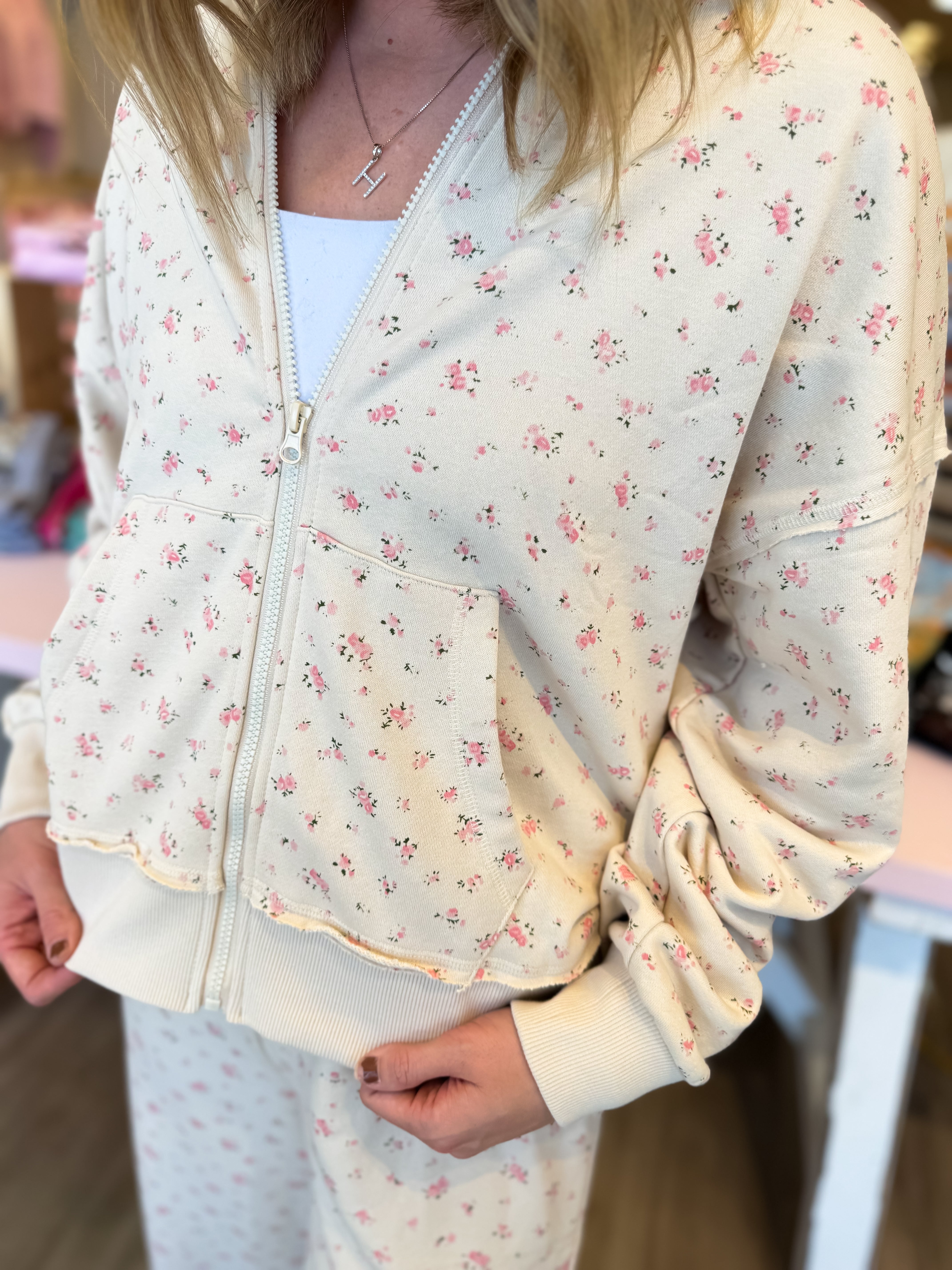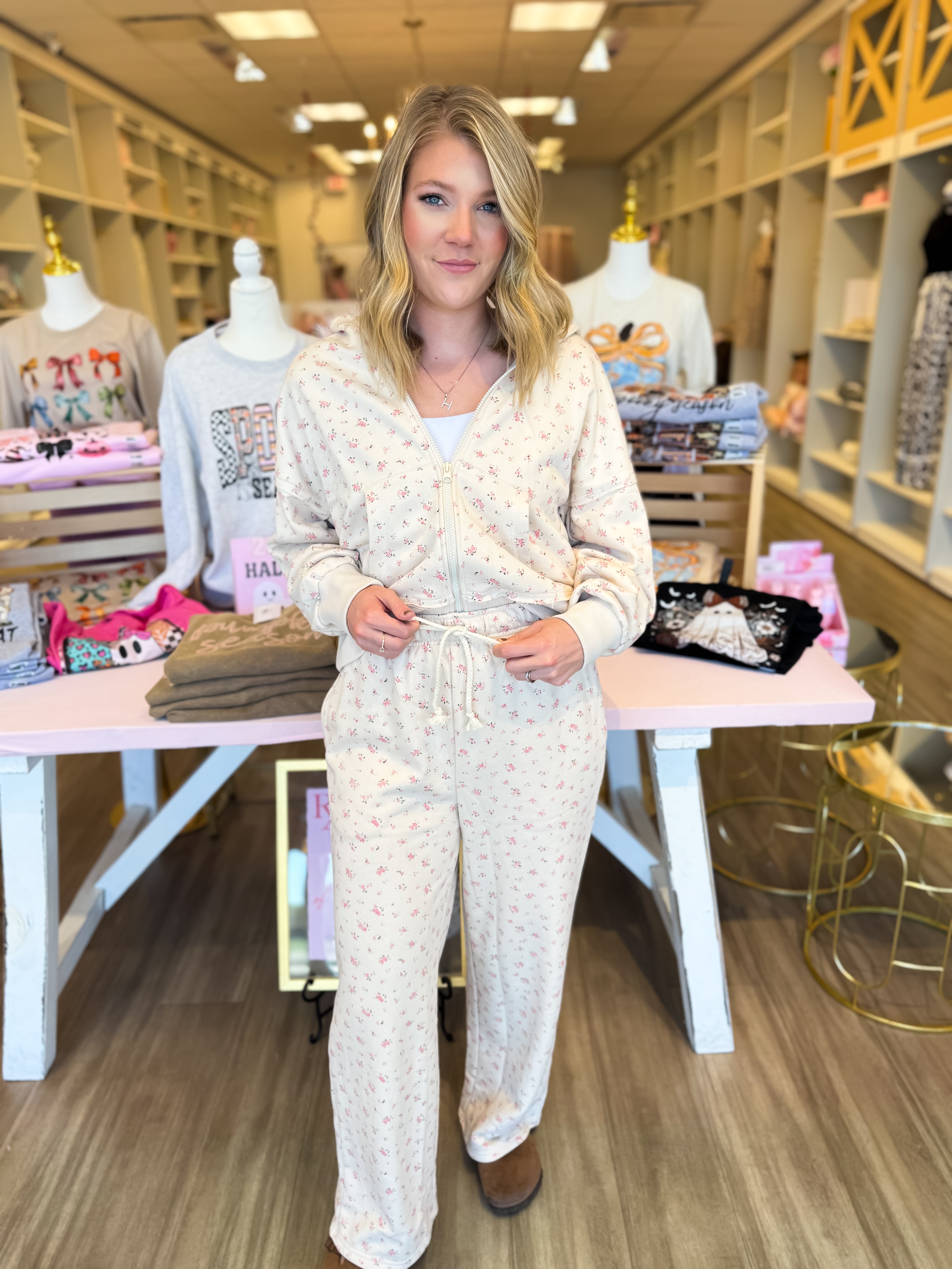 Soft, feminine, and effortlessly comfy — the Sweet Morning Floral Set is made for cozy days and cute errands alike. This cream-toned two-piece features a dainty floral print with a relaxed wide-leg fit and drawstring waist for ultimate comfort. The matching zip-up hoodie adds a laid-back yet polished touch, perfect for lounging or layering on the go.