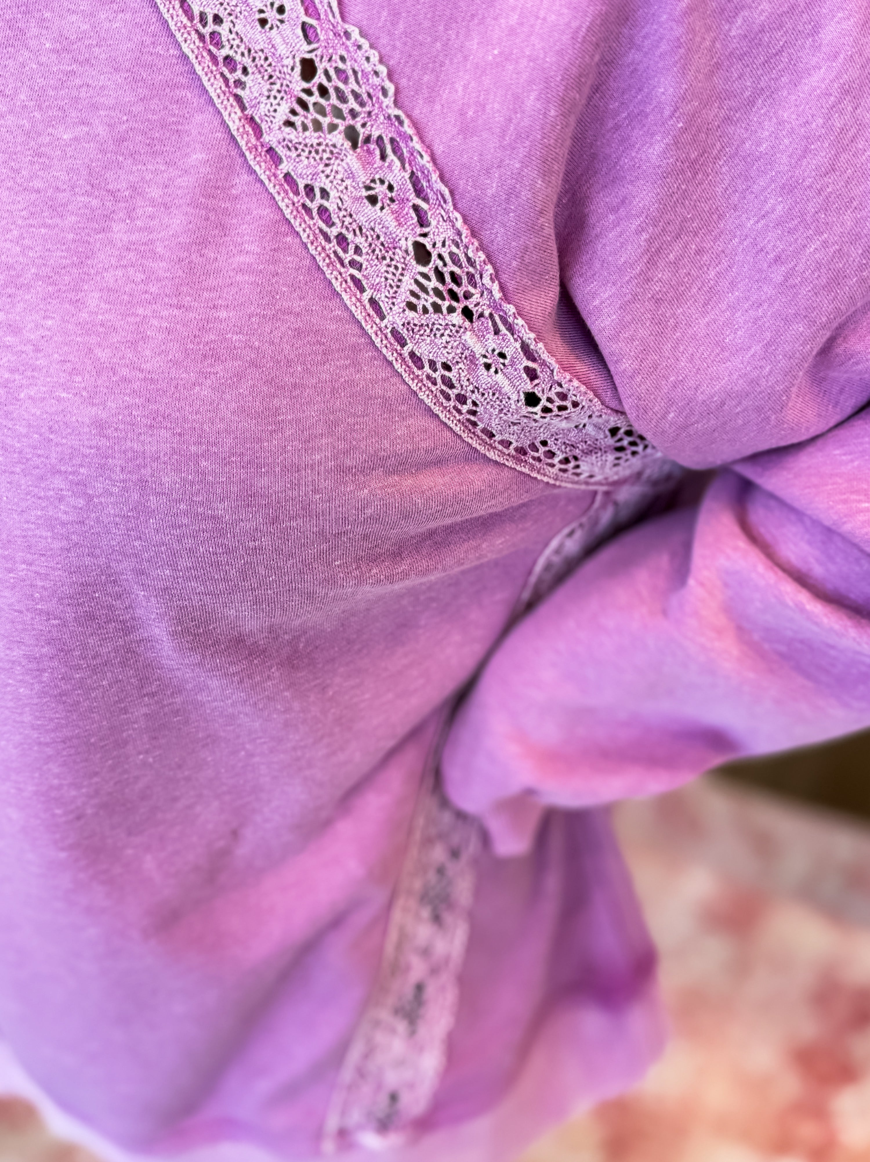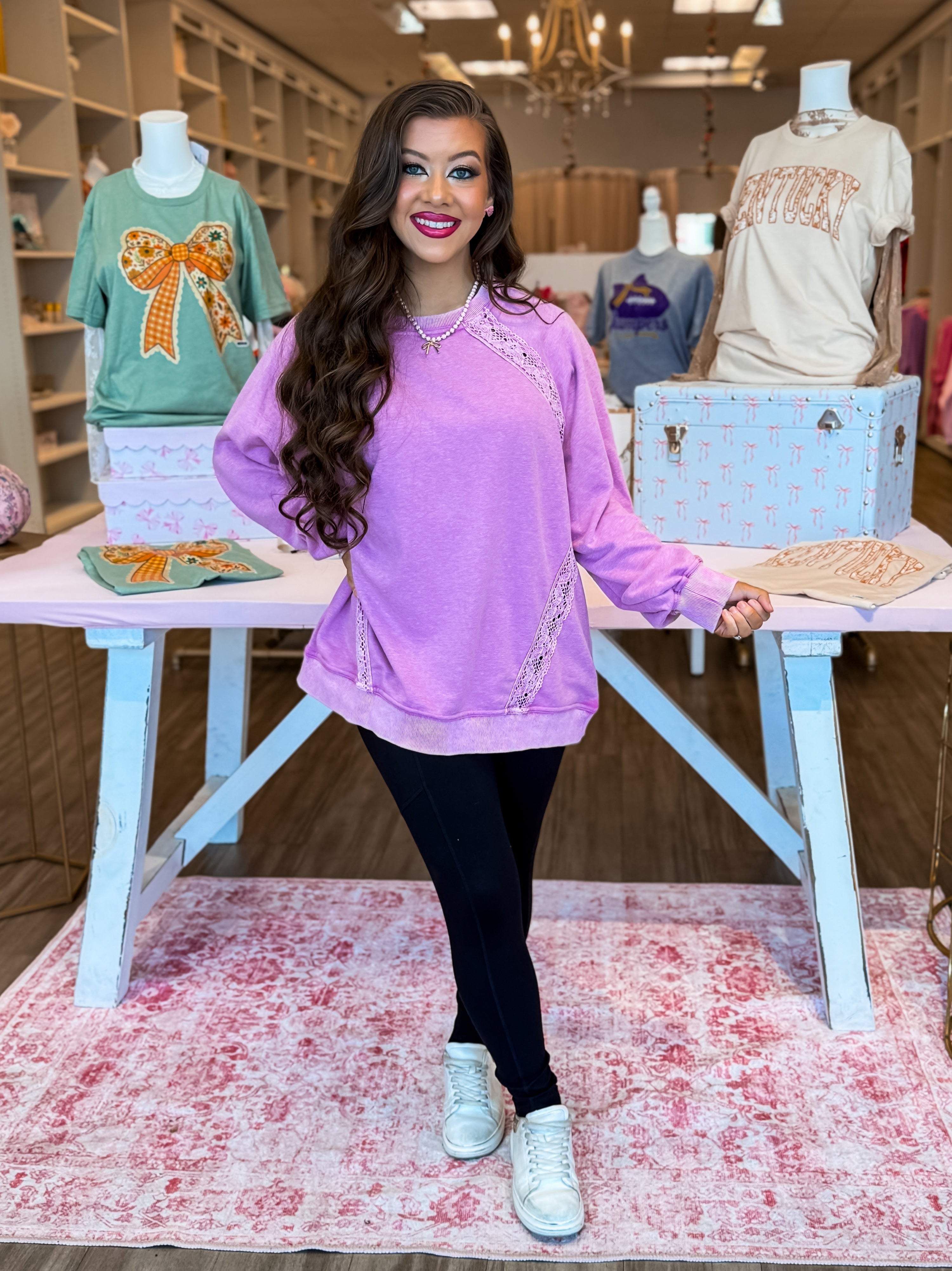 Add a feminine touch to your cozy days with our Lavender Lace Detail Sweatshirt. This soft pullover features delicate lace accents along the shoulders and sides, giving it a sweet and girly twist on a classic casual piece. With its relaxed fit and lightweight fabric, it’s perfect for everyday wear—whether you’re running errands, lounging at home, or styling it up with leggings and sneakers for a chic on-the-go look.