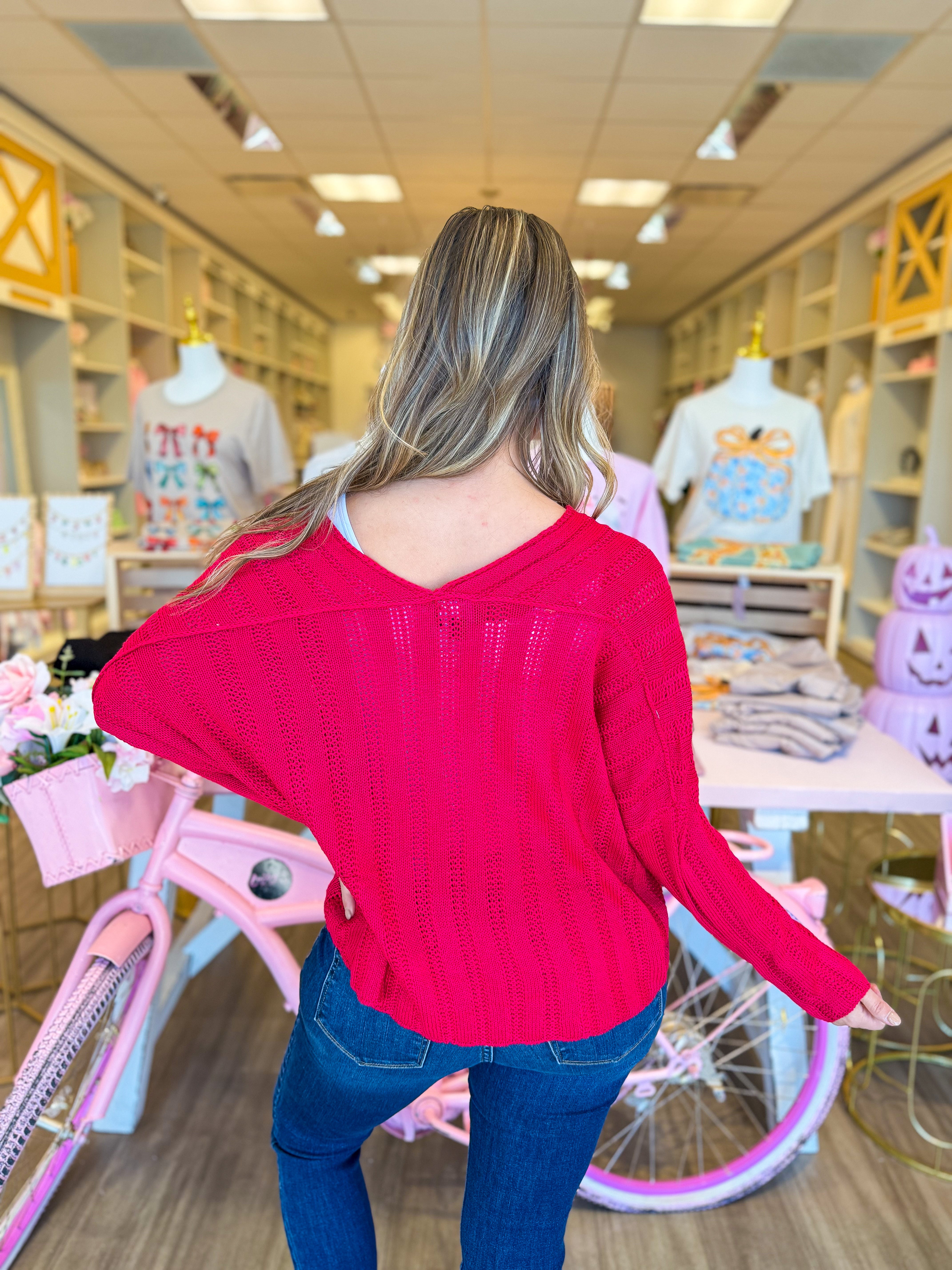 Make a bold and beautiful statement in our Kiss Me Crimson Knit Top — the perfect mix of cozy and flirty! Featuring a lightweight open-knit design, relaxed fit, and subtle front twist, this top drapes effortlessly for that “styled but comfy” look.