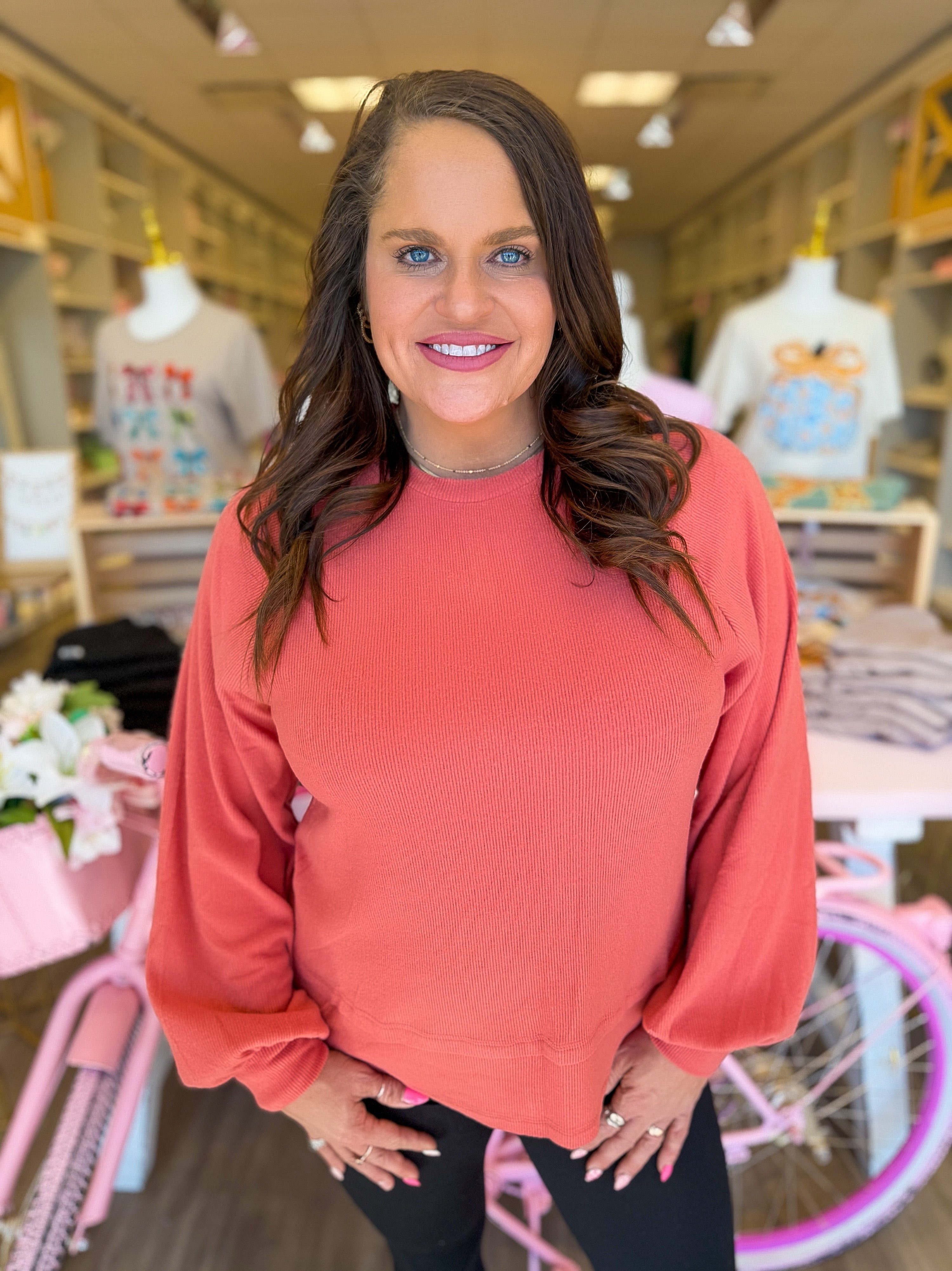 Cozy, comfy, and oh-so-cute — our Pumpkin Spice Balloon Sleeve Top is the perfect fall favorite! 🍁 This soft knit top features a gorgeous warm rust color and subtle ribbed texture with relaxed balloon sleeves that add the perfect feminine touch. Ideal for pairing with jeans, leggings, or a cute skirt for all your autumn adventures!